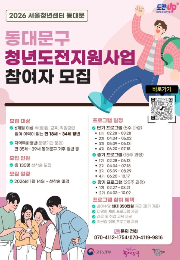서울 동대문구는 구직을 잠시 멈춘 청년들이 다시 일상과 노동시장으로 돌아올 수 있도록 ‘2026년 청년도전지원사업’ 참여자를 모집 중이라고 밝혔다. 동대문구는 “구직 단념 청년에게 가장 필요한 것은 ‘의지’가 아니라 다시 움직일 수 있게 해주는 과정과 동력”이라며, 심리·생활 기반을 다지고 진로·취업으로 연결하는 단계별 프로그램을 마련했다.