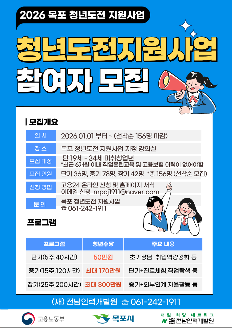 목포시는 고용노동부 공모사업인 ‘2026년 청년도전 지원사업’에 선정됨에 따라, 구직에 어려움을 겪고 있는 지역 청년을 대상으로 사업 참여자를 모집한다.