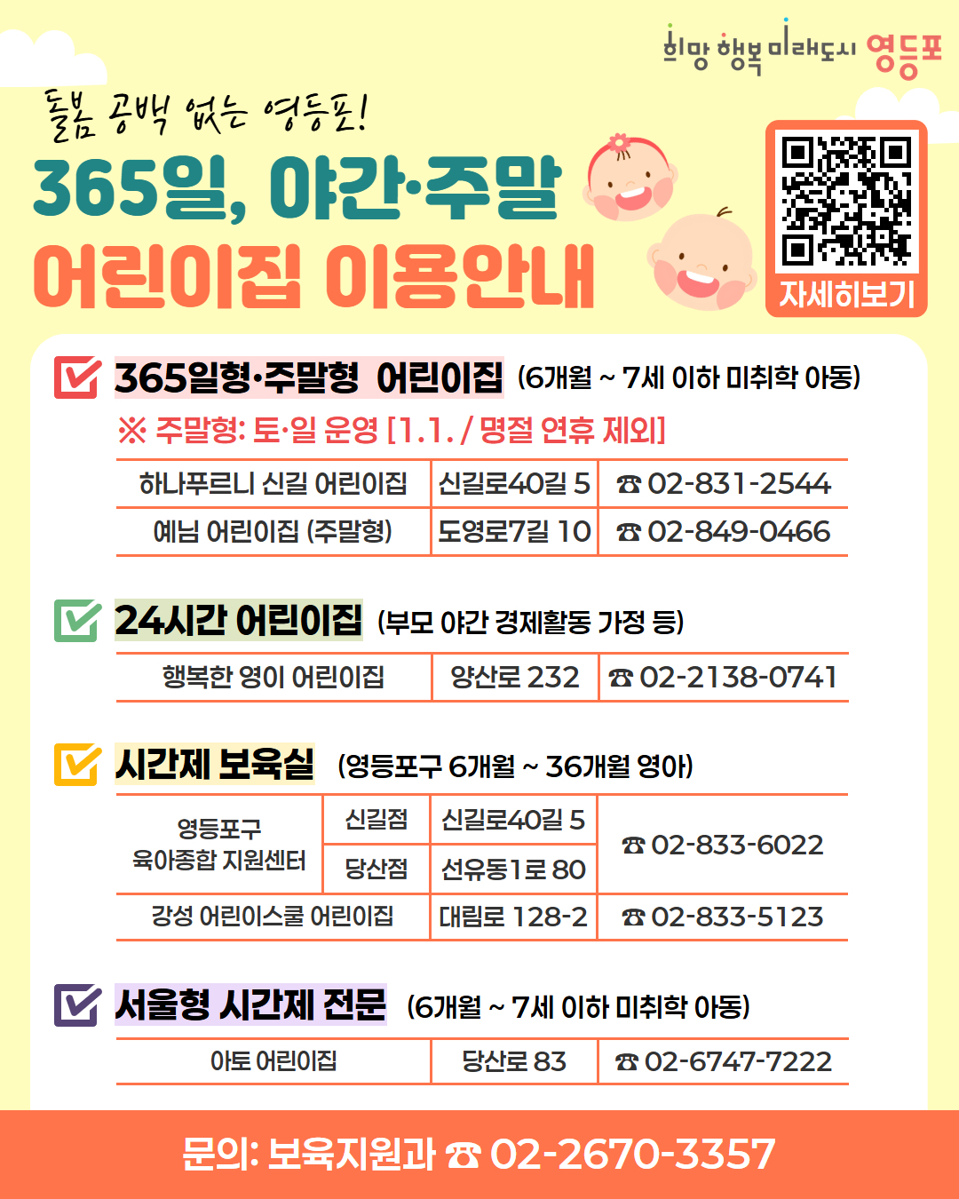 현재 6개월~36개월 영아를 대상으로 영등포구 육아종합지원센터 2개소와 강성어린이스쿨 어린이집에서 시간제 보육실을 운영하고 있으며, 6개월~7세 이하 미취학아동을 대상으로는 당산2동 아토 어린이집에서 서울형 시간제 전문 어린이집을 운영 중이다.
