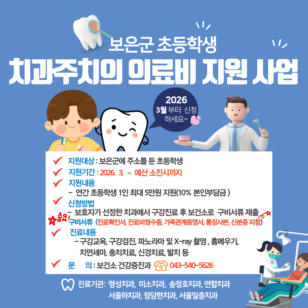 지원 대상은 보은군에 주소를 둔 초등학생 전 학년으로, 보호자 동의 후 참여할 수 있다. 학생 1인당 연간 최대 5만원까지 치과진료비를 지원하며, 10%의 본인부담금이 발생한다. 의료비는 지원 기준에 따라 3월부터 지급될 예정이다.