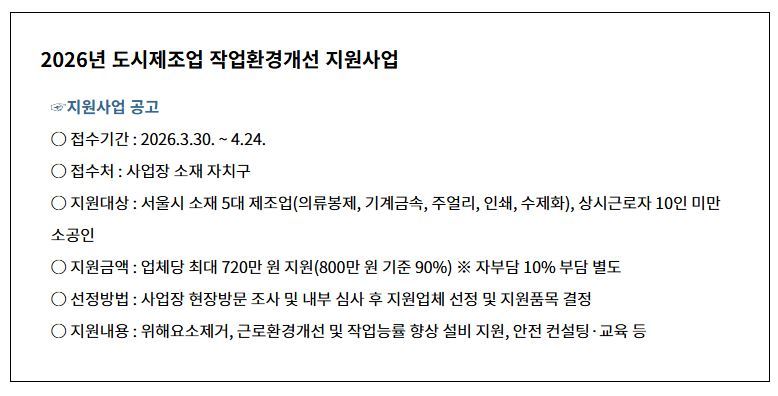 서울시가 2026년에도 열악한 제조환경의 안전과 작업능률을 높이기 위해 ‘도시제조업 작업환경 개선’ 사업을 추진한다.