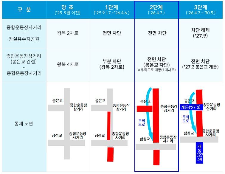 시는 대체 야구장(잠실주경기장) 개장 시점에 맞춰 봉은교에서 잠실주경기장으로 이어지는 주출입로를 조성해 2027년 3월 개통할 예정이다.