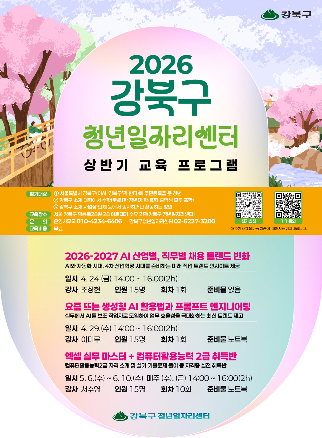 신청은 포스터에 안내된 큐알(QR)코드를 통해 가능하며, 교육 과정 및 일정 등 자세한 사항은 강북구 청년일자리센터(☎02-6227-3200)로 문의하거나 강북구청 홈페이지(강북소개>강북소식>새소식)을 참고하면 된다.