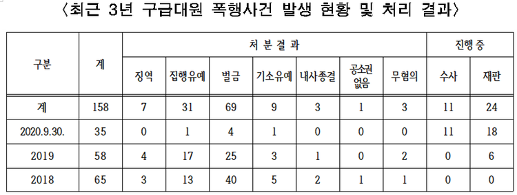 서울특별시의회 김태수 의원(더불어민주당/중랑구2)이 서울시에서 받은 ‘최근 3년 구급대원 폭행사건 발생 현황 및 처리 결과’에 따르면, 2018년 65건, 2019년 58건, 올해는 9월 기준 35건이 발생했다.