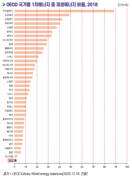 경제협력개발기구 (OECD) 가 2020년 발표한 자료에 따르면 2018년 기준, 대한민국의 탄소배출량은 미국, 일본, 독일 등 OECD 회원국 중 6위 인 것으로 나타났다. 전기 생산을 위해 배출한 온실가스 발생 순위로는 4위에 달해 재생에너지 사용률 또한 최하위 수준인 4.89%에 그쳤다.