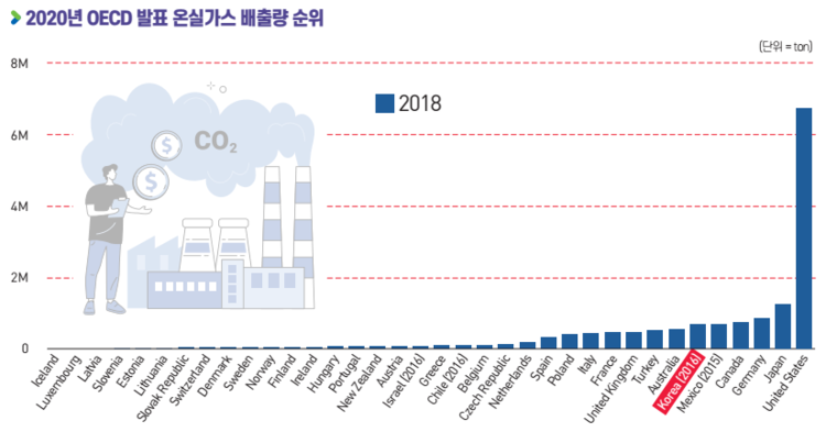 이는 2019년 기준 OECD 회원국 평균 27%에 한참 미치지 못하는 수치이며, 심지어 개발도상국으로 분류되는 멕시코나 체코에 비해 뒤떨어지는 결과다. OECD가 발표한 2018년 한국의 온실가스 총 배출량은 727.6 백만톤으로 집계돼 1990년 대비 2.5배에 달하는 것으로 나타났다.
