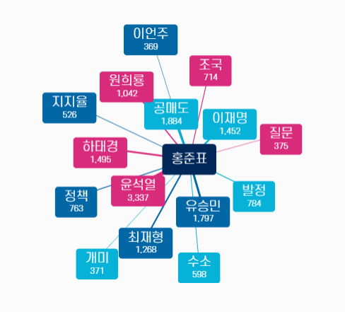 소셜 빅데이터 분석 사이트인 썸트렌드(some.co.kr)에서 주요 대선 후보에 대한 긍·부정 분석을 9월 30일부터 10월 29일까지의 데이터로 살펴보았다. 먼저 이재명 후보의 경우 부정 75.3%, 긍정 22%, 중립 2.7%로 언급되었다. 윤석열 후보는 부정 75.4%, 긍정 20.7%, 중립 3.9%로 이재명 후보와 큰 차이가 없었다. 반면 홍준표 후보는 부정 66.8%, 긍정 28.9%, 중립 4.3%를 차지했다. 홍준표 후보가 이재명 후보와 윤석열 후보보다 부정이 더 적었고, 긍정에서는 더 높았다. 물론 인스타, 블로그, 뉴스, 트위터 분석 결과로 리트윗을 제거하지 않은 수치지만 최근 한 달 동안의 분석 결과에서 홍준표 후보의 지지세가 높은 것은 부인할 수 없는 것 같다. KBS가 10월 29일 한국리서치에 의뢰해 보도한 대선기획 여론조사 결과에서도 대선후보 가상 대결 시 이재명 대 윤석열은 37.5% 대 35.4%였고, 이재명 대 홍준표는 35.6% 대 41.9% 였다.