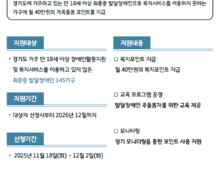 경기도가 2026년 최중증 발달장애인 가족돌봄 사업 대상자 145가구를 12월 2일까지 모집한다. 최중증 발달장애인이란 도전적 행동이 심하고 일상생활에 제약을 지닌 통합돌봄이 필요한 발달장애인이다. 경기도는 돌봄이 필요한 모든 도민들을 대상으로 누구나, 언제나, 어디나 빈틈없는 돌봄을 제공하는 360도 돌봄사업을 하고 있다. 최중증 발달장애인 가족돌봄 사업은 이 가운데 ‘어디나 돌봄’ 사업의 하나로 진행한다. 2024년 4월 처음 가족돌봄 사업을 시행한 이래 매달 210가구에 월 40만 원씩 돌봄포인트를 제공해 생필품 구입부터 여가활동 지원까지 다양한 부분에서 사용하여 장애인 당사자와 가족의 생활안정에 기여하고 있다. 2026년 최중증 발달장애인 가족돌봄 사업의 지원 대상은 경기도에서 거주하는 복지관, 직업재활서비스 등 복지서비스 미이용으로 돌봄사각지대에 놓인 만 18세 이상 발달장애인이다. 선정 시 월 40만 원 가족돌봄포인트를 1년간 지원하고 지속적인 모니터링으로 복지서비스와 대상자를 연계하는 서비스를 제공한다. 2026년 모집인원은 145명으로 전년과 다르게 모집인원을 시군별 배분해 31개 모든 시군에서 공정하게 선정자가 나오도록 반영했다. 신청은 11