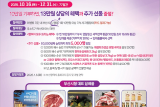 부산시는 지난 10월 16일부터 진행 중인 「역대급 경품 대발사 시즌2! 부산 고향사랑기부제 연말 빅 이벤트」에 많은 동참을 당부했다. 이번 이벤트는 「제106회 전국체육대회」와 연계하여 시작됐으며, 현재까지 5천여 명의 소중한 참여가 이어지고 있다. 시는 연말까지 총 5만 명 달성을 목표로 남은 기간 4만 5천 명의 따뜻한 마음을 기다리고 있다. 특히, 시는 연말을 맞아 기부자들에게 감사의 마음을 전하고 선택의 폭을 넓히기 위해 특별한 답례품을 추가로 준비했다. 기존 답례품 외에 새롭게 선보이는 답례품으로 ▲국제식품의 삼겹살·목살세트 ▲삼진식품의 캠핑어묵세트 ▲이흥용과자점의 슈톨렌(독일식 크리스마스 케이크) ▲가락농협의 뉴황금쌀 등이 포함되어 기부자들의 높은 호응이 기대된다. 현재까지 기부자들이 가장 많이 선택한 인기 답례품은 ▲국제식품 삼겹살 ▲삼진식품 어묵세트 ▲개미집 낙곱새 ▲가락농협 뉴황금쌀 ▲부산지역화폐 동백전 등으로 나타났다. 아울러, 기부자 모두에게 제공되는 답례품 외에도 경품 행사를 통해 해운대 5성급 호텔 숙박권, 한우등심세트 등을 제공한다. 행사에 관한 자세한 사항은 ‘부산 고향사랑기부제’ 누리집(busanlove.kr)에서 확인할 수 있