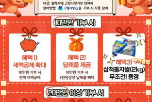 삼척시는 2026년 고향사랑기부제 세액공제 혜택 확대를 기념해 설 명절을 맞아 「삼척시 고향사랑기부제 설맞이 이벤트」를 진행한다. 이번 이벤트는 고향사랑기부제에 참여한 기부자들에게 감사의 마음을 전하고, 기부 문화 확산을 도모하기 위해 마련된 것으로, 세액공제 혜택과 답례품, 설맞이 특별 선물까지 제공하는 명절 한정 행사다. 이번 이벤트는 추첨 방식이 아닌, 기간 내 기부한 모든 기부자에게 혜택을 제공하는 것이 가장 큰 특징이다. 기부 금액에 따라 세액공제 혜택과 답례품, 설맞이 특별 선물을 모두 받을 수 있어 혜택 체감 효과를 크게 높였다. 이벤트 기간 중 10만 원을 기부하면 전액 세액공제 혜택과 함께 3만 원 상당의 답례품 포인트가 제공되며, 설맞이 특별 선물로 삼척동자 맑은 쌀 2kg이 추가 증정된다. 20만 원을 기부할 경우에는 총 14만 4천 원의 세액공제 혜택과 6만 원 상당의 답례품 포인트가 제공되며, 특별 선물로 쌀 10kg이 추가 증정된다. 해당 쌀은 기존 답례품과는 별도로 제공된다. 참여 방법은 ‘고향사랑e음’을 통해 강원특별자치도 삼척시에 기부하면 별도의 신청 절차 없이 자동으로 참여할 수 있다. 이벤트 기간은 2월 1일부터 2월 22일