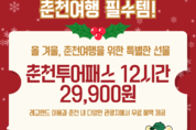춘천시가 연말·겨울철 관광 수요에 맞춰 기간한정으로 ‘춘천 투어패스 12시간권’을 출시했다. 춘천투어패스는 주요 관광지와 체험 프로그램을 정해진 시간 동안 자유롭 게 즐길 수 있는 통합 관광상품이다. 특히 이번 12시간권에는 레고랜드 코 리아 이용권이 포함돼 있어 연말 시즌 가족·연인 단위 방문객에게 특히 매 력적인 구성이다. 특가 통합권 가격은 2만 9,900원으로 12일부터 18일까지 티켓파파(https://ticketpapa.co.kr)에서만 구매할 수 있다. 구매 고객은 모바일 티켓을 문자 또는 알림톡으로 바로 발급받고 가맹시 설 입구에서 제시만 하면 간편하게 이용할 수 있다. 시 관계자는 “연말 춘천여행을 하루 동안 알차게 즐길 수 있도록 레고랜드 를 포함한 12시간권을 기획했다”며 “겨울철 춘천을 찾는 가족·연인들에게 더 풍성한 여행 경험이 되길 바란다”고 말했다.