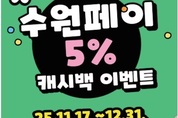 수원페이를 사용하면 11월 17일부터 5% 캐시백을 받을 수 있다. 수원특례시는 17일부터 12월 31일까지 ‘수원페이 5% 캐시백 이벤트’를 연다. 수원페이 충전금으로 결제하면 5% 캐시백을 지급한다. 1인당 최대 5만 원을 지급하고, 예산이 소진되면 이벤트는 종료된다. 이벤트 기간에 받은 캐시백은 2026년 3월까지 사용할 수 있다. 수원시는 지역사랑상품권 우수 지자체로 선정돼 추가로 국비를 확보했고, 캐시백 이벤트를 진행한다. 수원시 관계자는 “수원페이 5% 캐시백 이벤트로 소비가 늘어나 지역 경제에 활성화에 도움이 되길 바란다”고 기대했다.